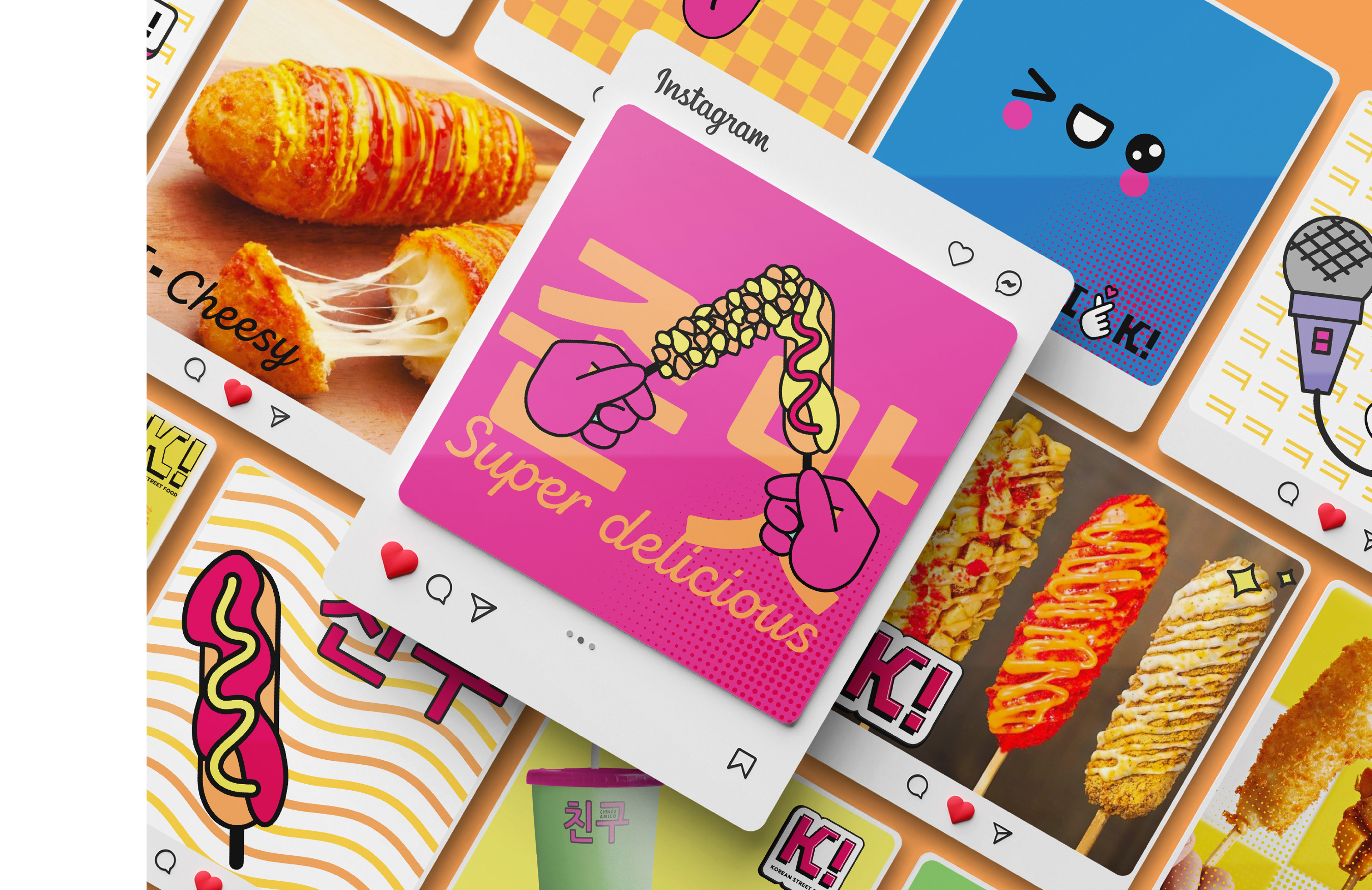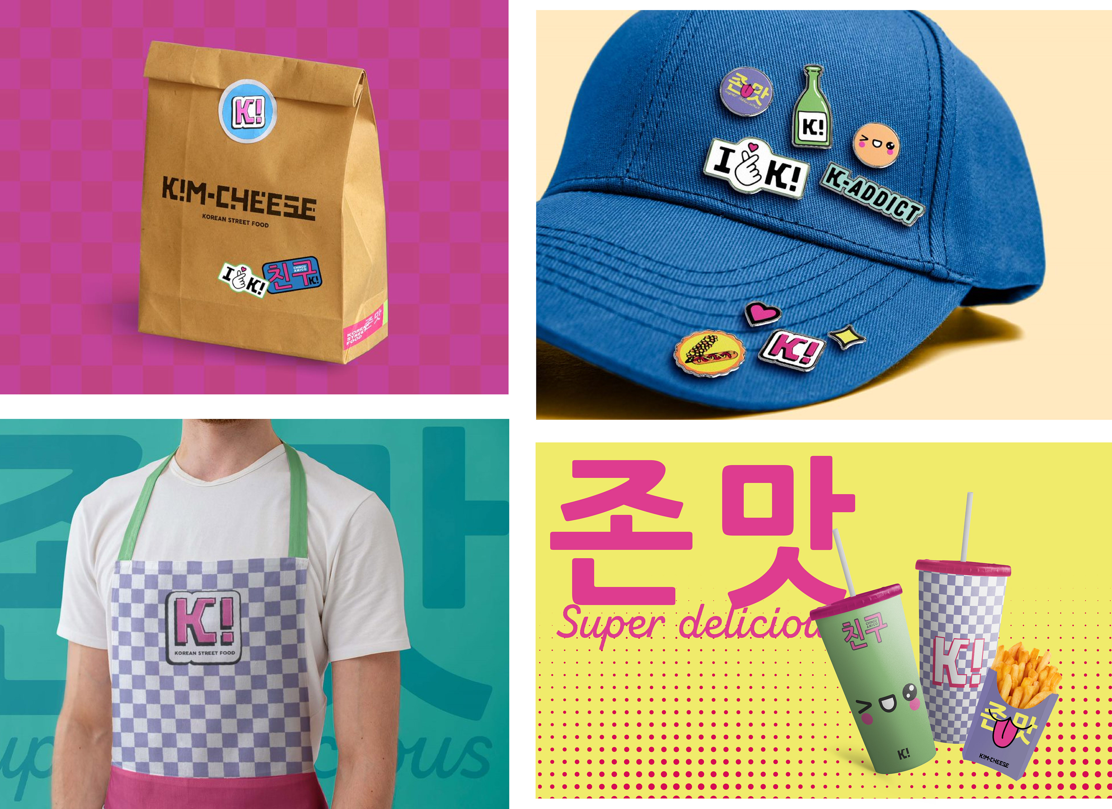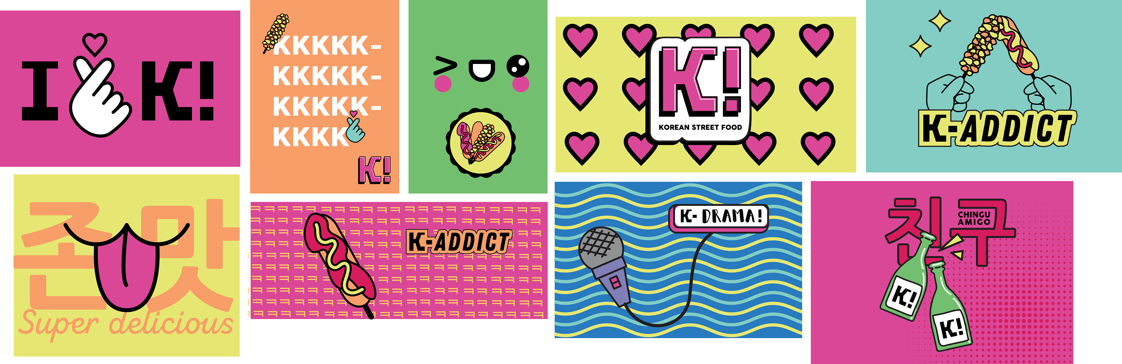 Inspired by the effervescence of K-Pop and the nostalgia of the 90s, we've crafted a visual identity that encapsulates the essence of Korean pop culture fused with an urban and playful touch. From the choice of saturated colors to the Asian typography, each element is carefully designed to transport consumers to a universe of flavors and memories. Our aim is to create a complete sensory experience that not only satisfies cravings but also invites exploration and shared moments with friends. This project not only embodies a passion for design but also a love for culture and creativity that defines our brand. Get ready to taste the difference and dive into the colorful world of our Korean skewers!